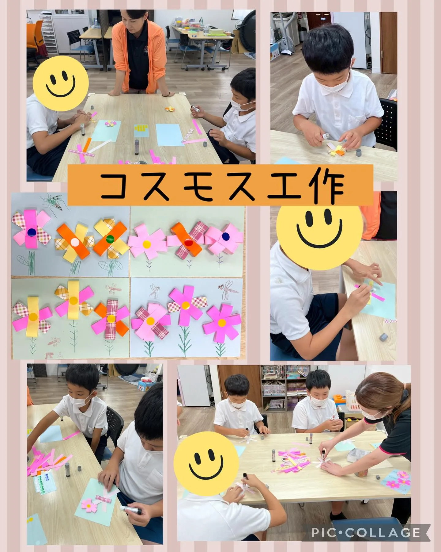 子ども達はトンボやバッタ、好きなマークを描いてオリジナルのコスモス工作が出来上がりました🥰